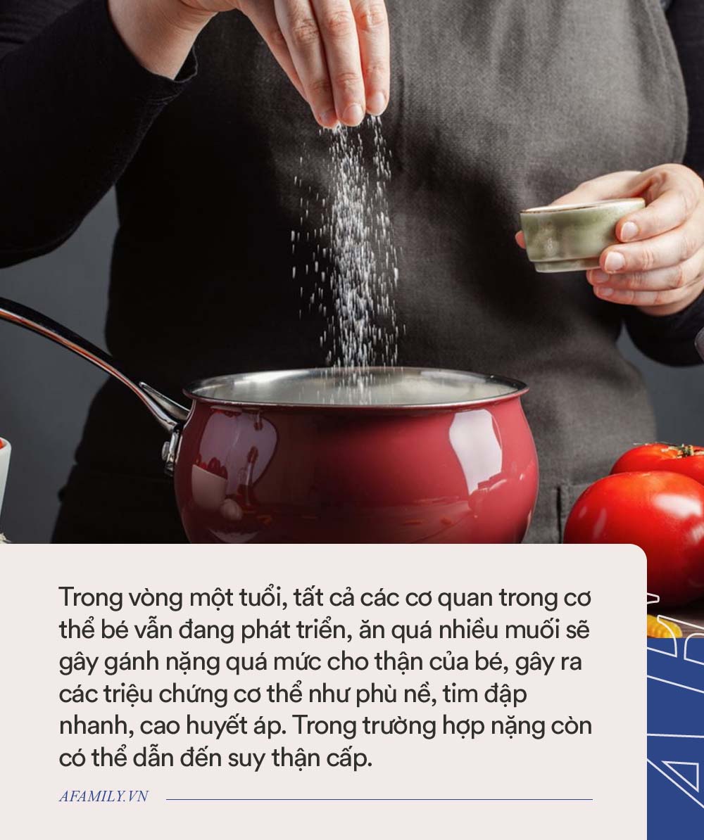 Trong vòng 1 tuổi, tất cả các cơ quan trong cơ thể bé vẫn đang phát triển, ăn quá nhiều muối sẽ gây gánh nặng quá mức cho thận của bé, gây ra các triệu chứng cơ thể như phù nề, tim đập nhanh, cao huyết áp. Trong trường hợp nặng còn có thể dẫn đến suy thận cấp.