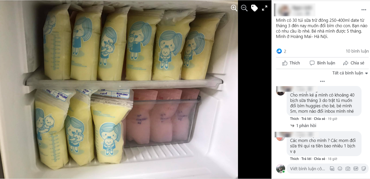 Ngày nay, các bà mẹ đều hiểu tầm quan trọng của sữa mẹ đối với con trẻ. Song, không phải mẹ nào cũng có được nguồn sữa dồi dào, đáp ứng đủ cho nhu cầu của trẻ cả về chất lượng lẫn số lượng. Có lẽ đó cũng là một trong những nguyên nhân lớn nhất khiến "thị trường" trao đổi sữa mẹ tự phát trên mạng xã hội ngày càng hoạt động rầm rộ. Theo đó, số lượng thành viên tham gia các hội nhóm này cùng những hoạt động thường xuyên với lượng tương tác cao chính là minh chứng rõ rệt nhất cho điều này. Bất cứ bài đăng cho/tặng sữa mẹ nào vừa được đăng lên đã có các mẹ bình luận, nhắn tin để xin và trao đổi sữa.
