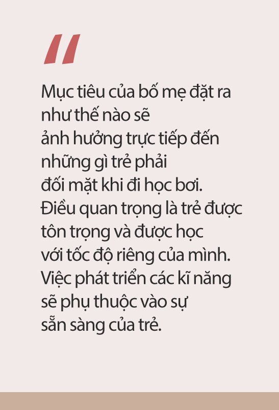 Không chỉ vậy, chị Khuyên cũng chia sẻ thêm, thông thường, bố mẹ rất mong những điều tốt nhất cho các con nên có những bố mẹ bị kì vọng quá nhiều về kết quả đầu ra, do vậy quá trình học bơi của trẻ sẽ trở nên áp lực nhiều hơn đối với các bạn. Mục tiêu của bố mẹ đặt ra như thế nào sẽ ảnh hưởng trực tiếp đến những gì trẻ phải đối mặt khi đi học bơi.