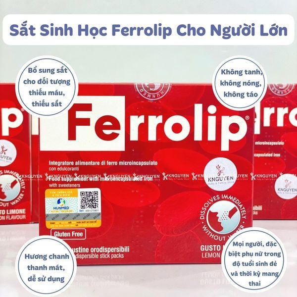 - Sắt sinh học Ferrolip bổ sung sắt cho cơ thể, hỗ trợ tạo hồng cầu, hỗ trợ giảm nguy cơ thiếu máu, thiếu sắt ở mọi đối tượng sử dụng